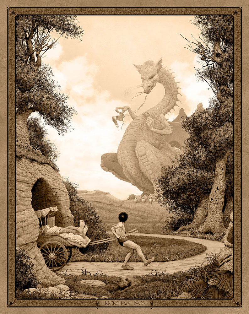 Artist's Statement: I've been fascinated by imaginative art and literature my entire life, and I've always tried to create work that has a narrative thread, whether it's my own story or that of another creator. I was an intaglio major in college, and that look is an important part of my work to this day -- the background plate-tone, the linear quality, sometimes even the illusion of a copper-plate edge -- even though I work mostly digitally now.
